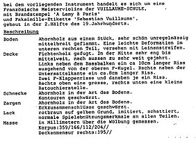 Decke: Fichtenholz, gefugt. Links neben dem Bassbalken ein ca. 10cm langer Riss, ausgehend von der oberen F-Kugel. Rechts neben der Untersattelkante ein ca. 8cm langer Riss. Lack: rotbraun auf gelbem Grund, imitiert, schattiert.