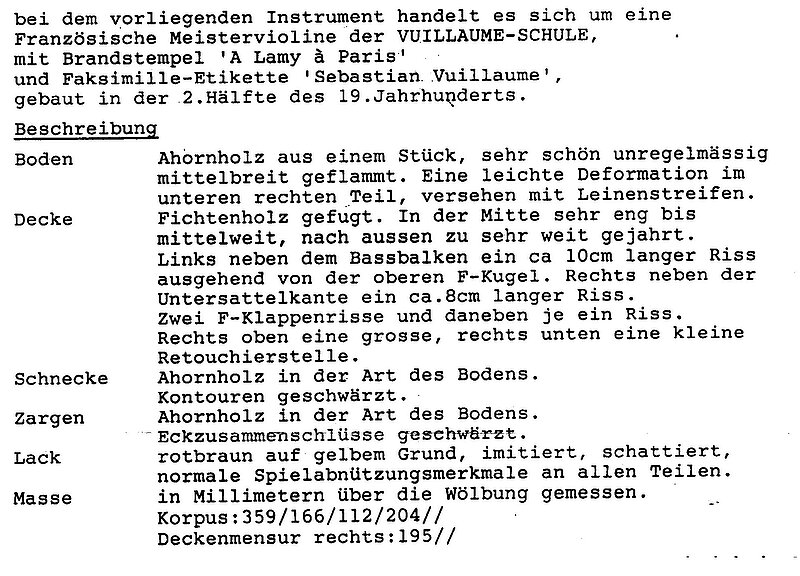 Eine französische Meistervioline der Vuillaume-Schule, mit Brandstempel "A Lamy à Paris" und Faksimile-Etikette "Sebastian Vuillaume", gebaut in der 2. Hälfte des 19. Jahrhunderts.